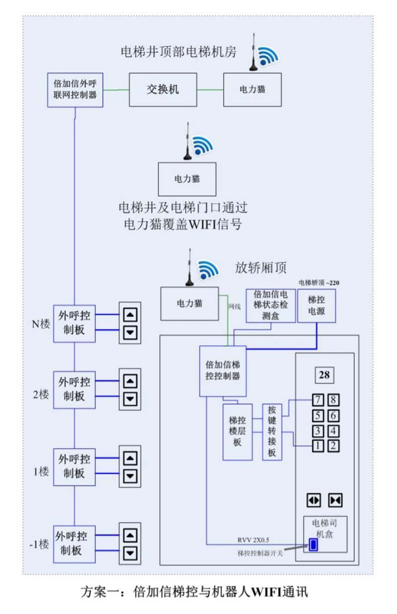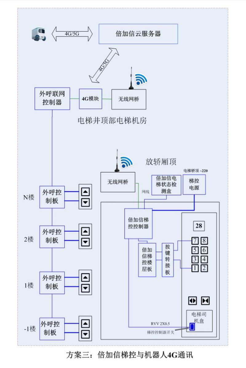 (1)機(jī)器人在電梯外,通個(gè)Wifi、藍(lán)牙、LoRa、Zigbee、2.4G、433M、語音或4G網(wǎng)絡(luò)等發(fā)送指令倍加信梯控系統(tǒng),系統(tǒng)自動(dòng)點(diǎn)亮上樓或下樓按鍵,實(shí)現(xiàn)呼梯功能。