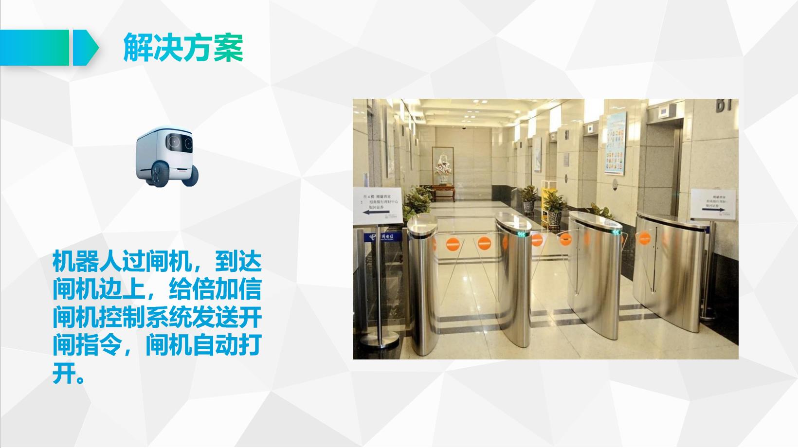 機器人過閘機,到達閘機邊上,給倍加信閘機控制系統(tǒng)發(fā)送開閘指令,閘機自動打開。