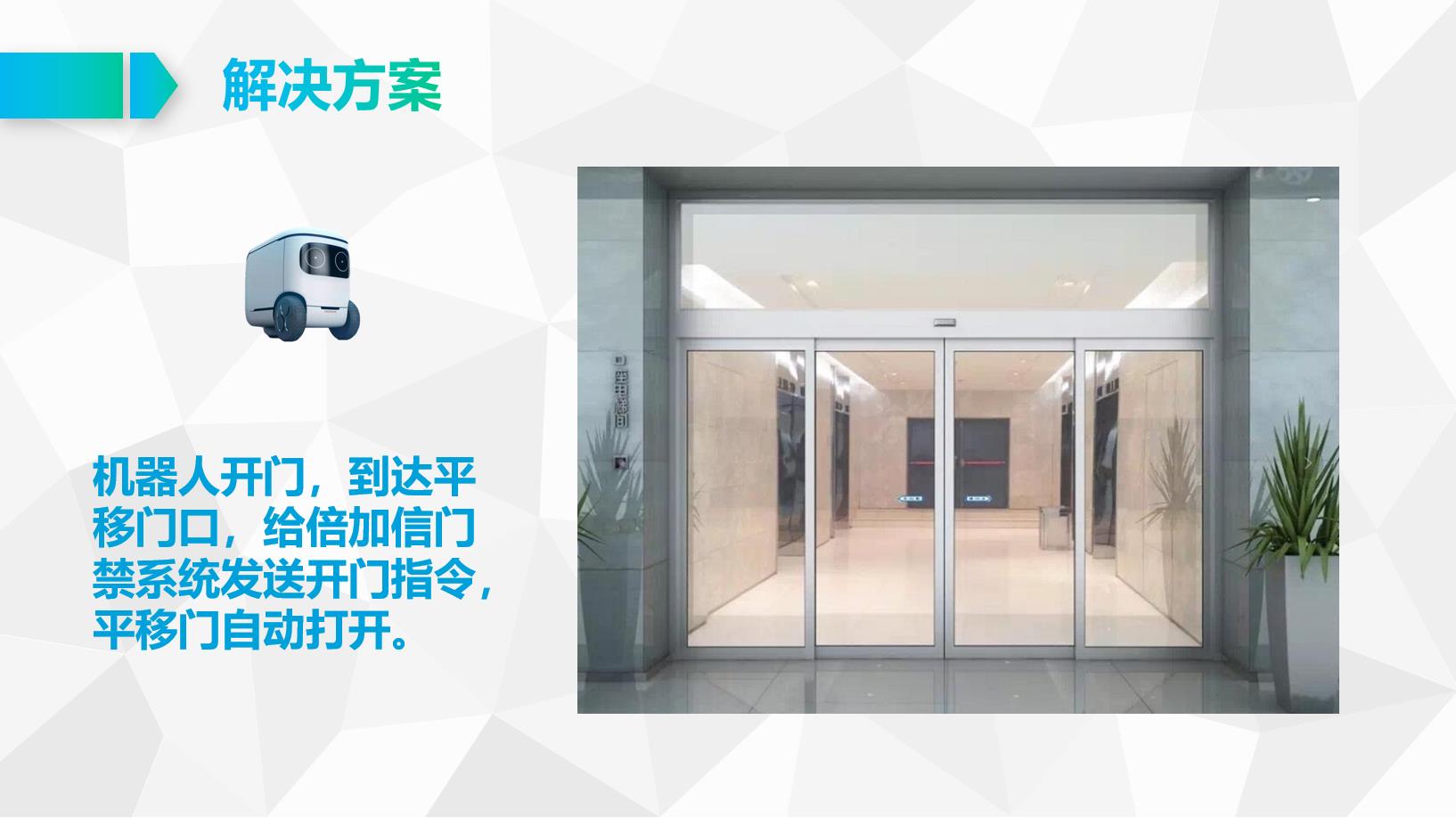 機器人開門,到達平移門口,給倍加信門禁系統(tǒng)發(fā)送開門指令,平移門自動打開。