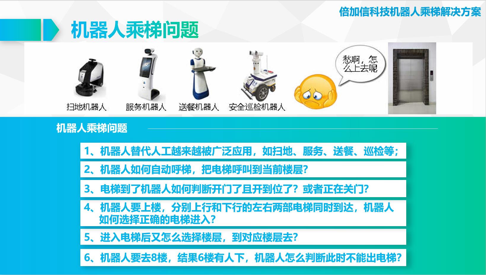 電梯呼梯:(1)機(jī)器人在電梯外,通個(gè)Wifi、藍(lán)牙、LoRa、Zigbee、2.4G、433M、語音或4G網(wǎng)絡(luò)等發(fā)送指令倍加信梯控系統(tǒng),系統(tǒng)自動點(diǎn)亮上樓或下樓按鍵,實(shí)現(xiàn)呼
