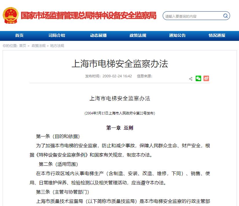 上海市質量技術監督局(以下簡稱市質量技監局)是本市電梯安全監察的行政主管部門。區(縣)質量技術監督局(以下簡稱區(縣)質量技監局)負責本行政區域內電梯的安全監察工作。