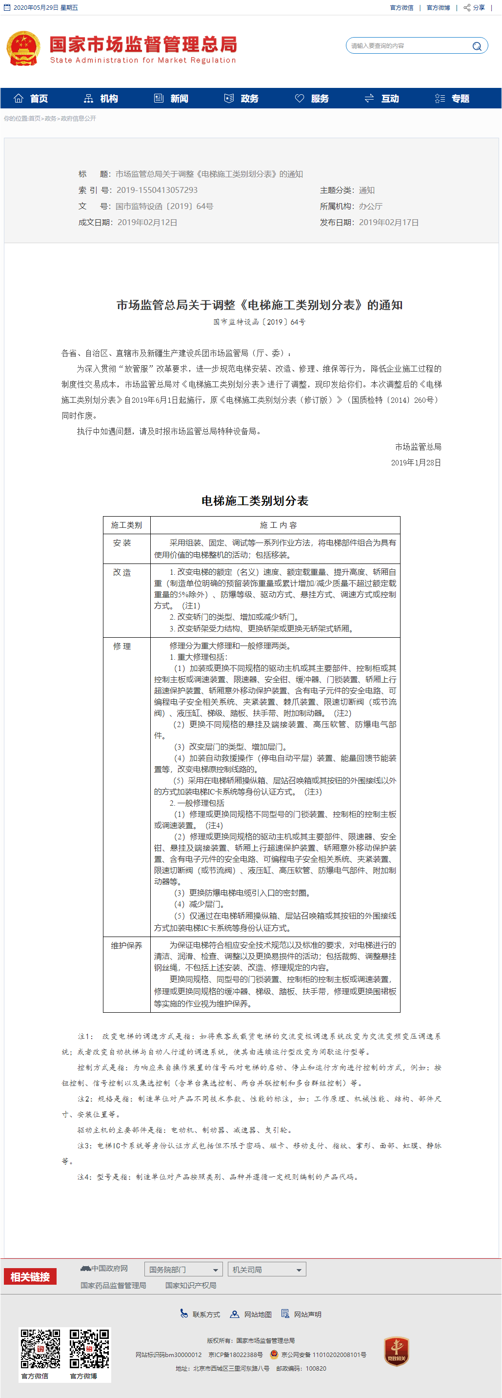 為深入貫徹“放管服”改革要求,進一步規范電梯安裝、改造、修理、維保等行為,降低企業施工過程的制度性交易成本,市場監管總局對《電梯施工類別劃分表》進行了調整,現印發給你們。本次調整后的《電梯施工類別劃分表》自2019年6月1日起施行,原《電梯施工類別劃分表(修訂版)》(國質檢特〔2014〕260號)同時作廢。