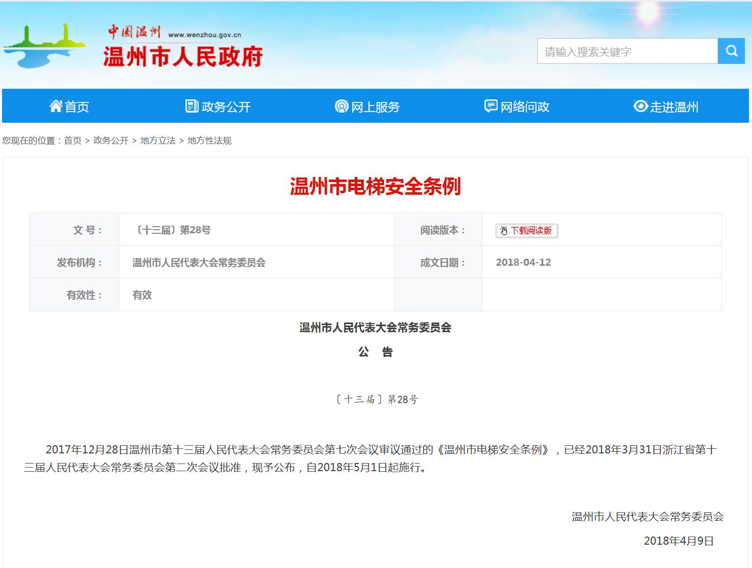 2017年12月28日溫州市第十三屆人民代表大會(huì)常務(wù)委員會(huì)第七次會(huì)議審議通過(guò)的《溫州市電梯安全條例》,已經(jīng)2018年3月31日浙江省第十三屆人民代表大會(huì)常務(wù)委員會(huì)第二次會(huì)議批準(zhǔn),現(xiàn)予公布,自2018年5月1日起施行。