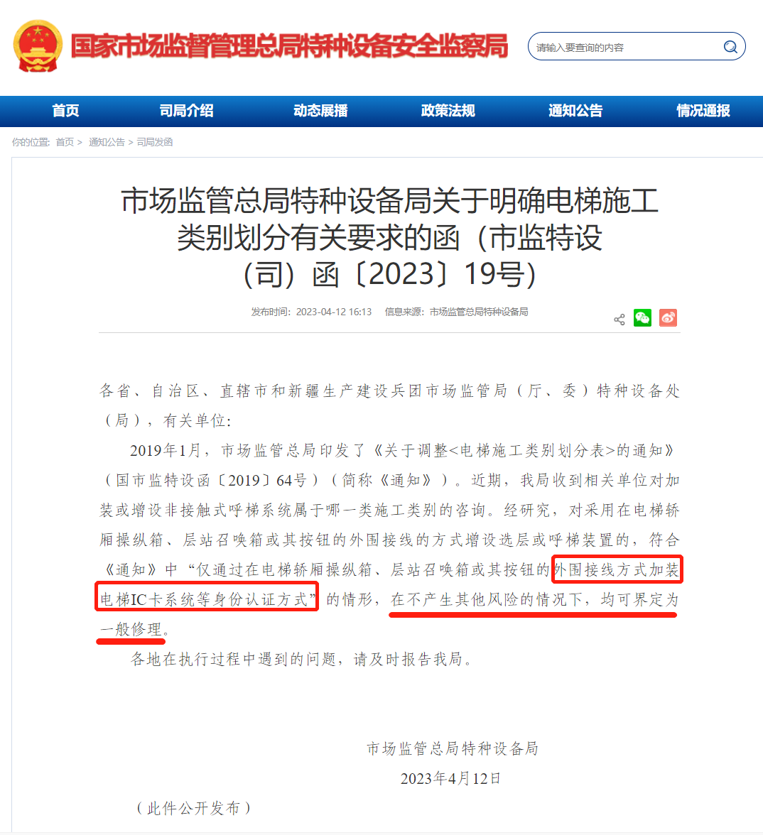 2023年4月12日市場監(jiān)管總局特種設(shè)備局再次發(fā)函,按鍵方式加裝梯控屬于一般修理。
